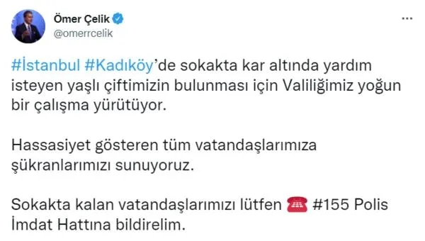 Konuyla ilgili olarak sosyal medya hesabından paylaşımda bulunan AK Parti Sözcüsü Ömer Çelik yaptığı açıklamada, "İstanbul Kadıköy'de sokakta kar altında yardım isteyen yaşlı çiftimizin bulunması için Valiliğimiz yoğun bir çalışma yürütüyor. Hassasiyet gösteren tüm vatandaşlarımıza şükranlarımızı sunuyoruz. Sokakta kalan vatandaşlarımızı lütfen 155 Polis İmdat Hattına bildirelim." dedi.