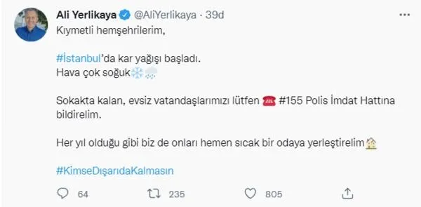 Konuya ilişkin İstanbul Valisi Ali Yerlikaya da bir paylaşımda bulundu. Yerlikaya paylaşımında "Kıymetli hemşehrilerim, #İstanbul'da kar yağışı başladı. Hava çok soğuk Sokakta kalan, evsiz vatandaşlarımızı lütfen #155 Polis İmdat Hattına bildirelim. Her yıl olduğu gibi biz de onları hemen sıcak bir odaya yerleştirelim #KimseDışarıdaKalmasın" şeklinde konuştu.