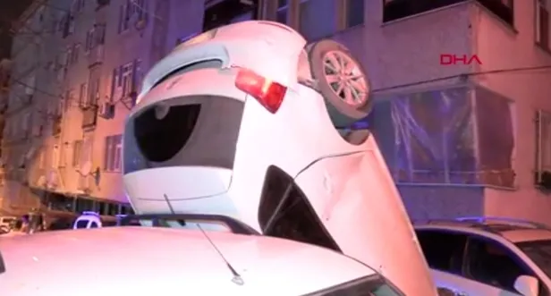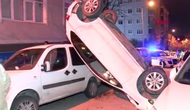 Bahçelievler'de gece saatlerinde bir sokakta seyir halindeki otomobil henüz bilinmeyen bir nedenle sürücüsünün direksiyon hakimiyetini kaybetmesi sonucu park halindeki iki araca çarptıktan sonra ters dönerek başka bir ticari aracın üzerine devrildi. Kaza sonrası otomobil dik bir şekilde asılı kalırken, sürücü olduğu iddia edilen alkollü bir kişi ve yanındaki yolcu gözaltına alındı.