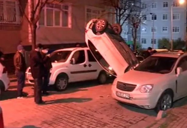 Daha sonrada otomobil ters dönerek park halindeki 34 DS 2208 plakalı başka bir ticari aracın üzerine devrilerek, dik bir şekilde asılı kaldı. Sürücü olduğu iddia edilen Emrah Y. ve beraberindeki arkadaşı kazayı yara almadan atlattı.