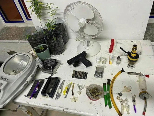 Otele düzenlenen operasyonda metanfetamin, 8 kök kenevir, kenevir tohumu, karışık kubar esrar, aydınlatma, ısıtma mekanizması, özel ışık sistemi, fişek ve kurusıkı tabanca ele geçirildi.