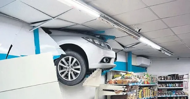 İstanbul Çekmeköy'de bir markete gelen müşteri, aracını park ederken fren yerine gaza bastı. Marketin camını kırıp, içeriye daldı. Market çalışanları ve müşteriler, içeri dalan otomobili görünce şaşkınlık yaşadı. Kazaya karışan araç, bir süre camda asılı kaldı.