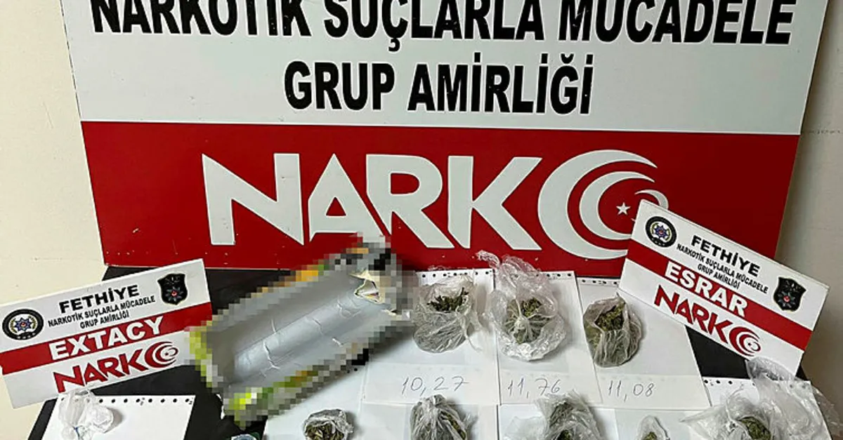 Sabah saatlerinde Fethiye girişinde düzenlenen operasyonda, araçta yapılan aramada meyve suyu kutusuna saklanan 65 gram kubar esrar ve 10 ecstacy uyuşturucu hap ele geçirildi.