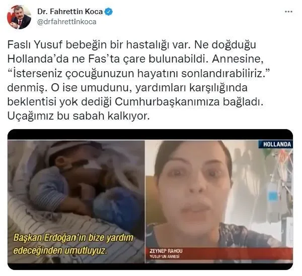 Koca, Twitter hesabından yaptığı açıklamada, "Faslı Yusuf bebeğin bir hastalığı var. Ne doğduğu Hollanda'da ne Fas'ta çare bulunabildi. Annesine, 'İsterseniz çocuğunuzun hayatını sonlandırabiliriz' denmiş. O ise umudunu, yardımları karşılığında beklentisi yok dediği Cumhurbaşkanımıza bağladı. Uçağımız bu sabah kalkıyor" ifadelerini kaydetti.