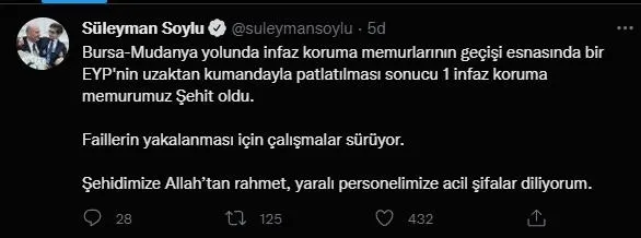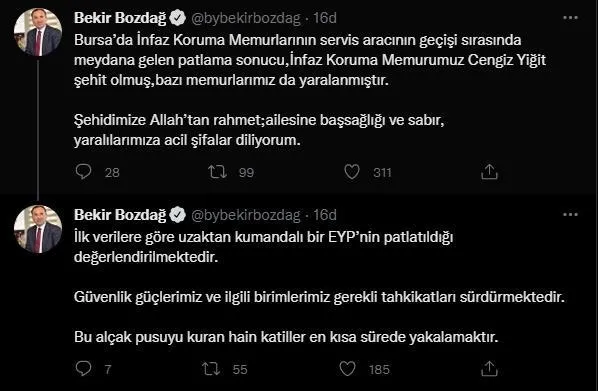 Bursa'da cezaevinde görevli infaz koruma memurlarını taşıyan servis otobüsüne yönelik bombalı saldırıda 1 ceza infaz koruma memuru şehit oldu.