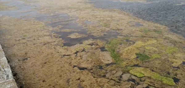 Büyükçekmece Gölü'nün denizle birleştiği bölgede bir haftadır esen rüzgar yosunları da beraberinde getirdi.