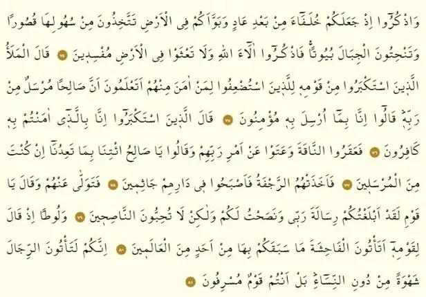 74.Vezküru iz cealeküm hulefae mim ba'di adiv ve bevveeküm fil erdı tettehızune min sühuliha kusurav ve tenhıtunel cibale büyuta fezküru alaellahi ve la ta'sev fil erdı müfsidın