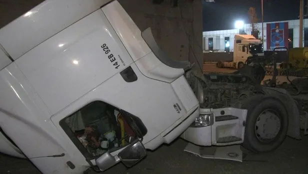 Çarpmanın etkisiyle lastikleri patlayan kamyonun kupası yerinden ayrılarak ters döndü.