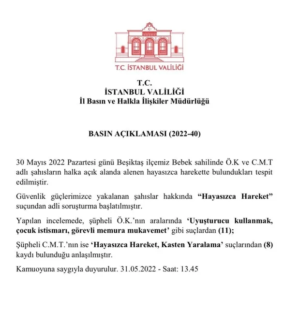 Son dakika haberine göre, Bebek sahilindeki uygunsuz görüntülerle ilgili soruşturma başlatıldı. Emniyet ekipleri tarafından gözaltına alınan şüpheliler, adliye getiriliyor. Öte yandan İstanbul Valiliğinden yapılan açıklamada, şüphelilerin hakkında çok sayıda suç kaydı olduğu ortaya çıktı. Valilikten yapılan son açıklamada ise bank üzerinde 'uygunsuz vaziyette' yatan M.Ç. adlı şüphelinin güvenlik güçlerince yakalandığı kaydedildi.