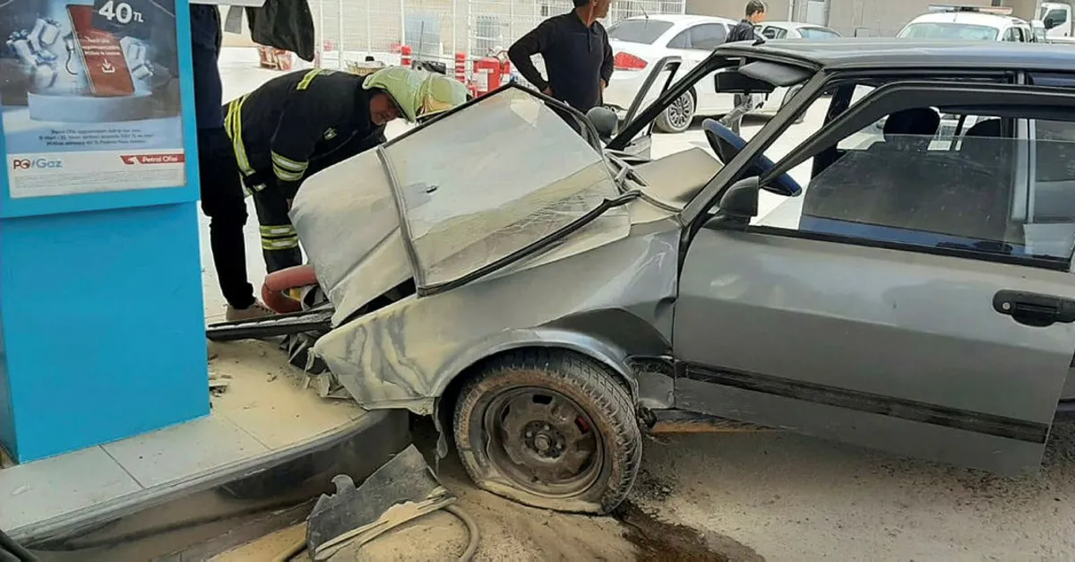 Bayburt'ta freni patlayan ve sürücüsünün kontrolünden çıkan bir otomobil, akaryakıt istasyonuna girdi. Facianın ucundan dönülen kazada 2 kişi yaralandı.