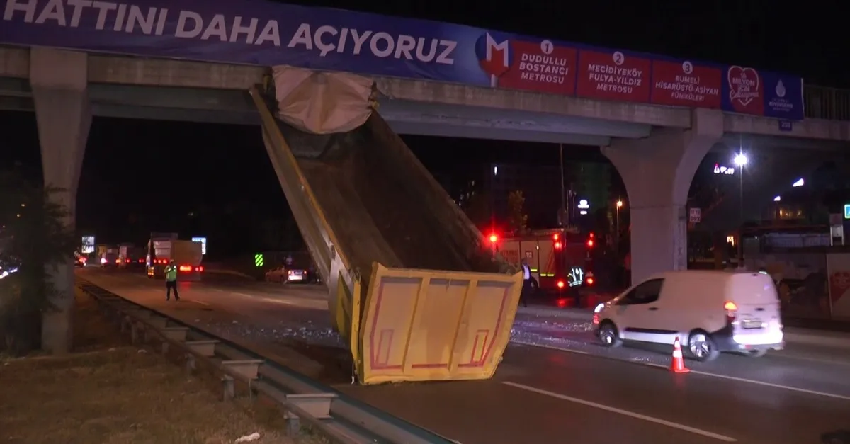 Çekmeköy Şile Otoyolunda seyir halindeki hafriyat malzemesi taşıyan tırın açık kalan damperi üst geçide çarparak asılı kaldı. Damper üst geçide asılı kalırken, tırın kupası 100 metre ileriye gitti. Kazayı gören vatandaşlar sokağa dökülerek film izler gibi üst geçide asılı kalan damperi izledi.