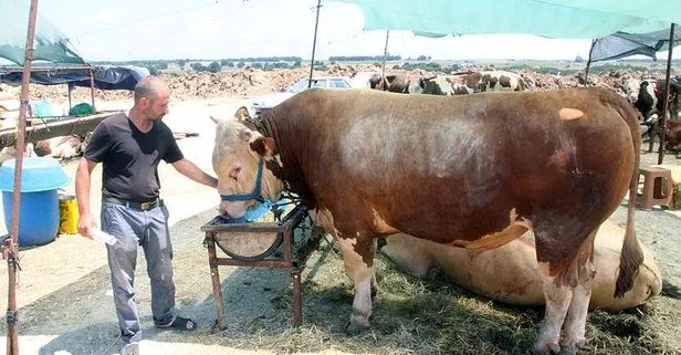 Çerkezköy hayvan pazarındaki 1 ton 50 kilogram ağırlığıyla sahiplerinin "Paşa" ismini verdiği boğa pazara girenlerin dikkatini topluyor.