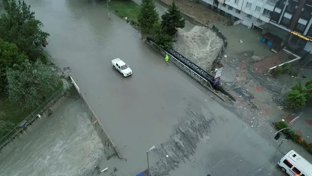 İstanbul Esenyurt'ta şiddetli yağış sonrası taşan Haramidere'nin çevresindeki birçok ev ve iş yerini su bastı.