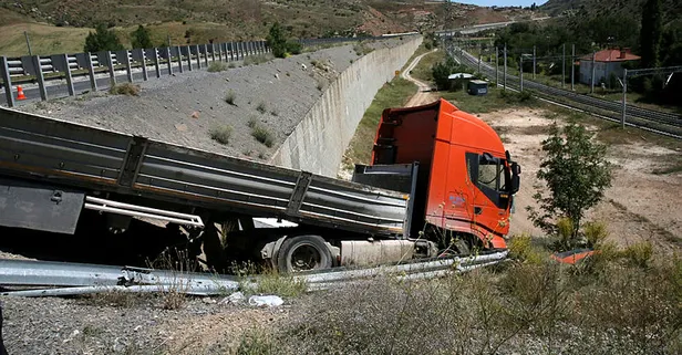 Sivas'ta kontrolden çıkan beton blok yüklü TIR, bariyerleri aşıp, 10 metre yüksekliğindeki istinat duvarına metreler kala toprağa saplandı. Kazada sürücü yaralandı.