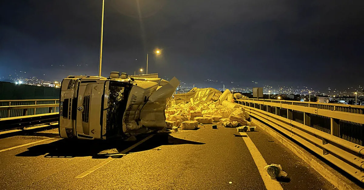 M.C. idaresindeki 27 HG 628 plakalı tır, otoyolun İzmit Doğu gişeleri bağlantı yolunda devrildi.