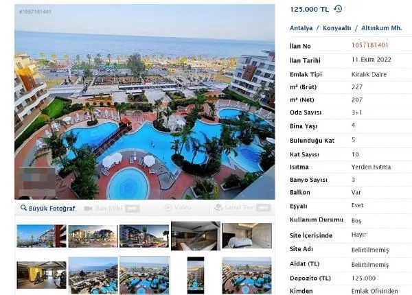 Savaş sonrası Rus ve Ukraynalıların yaşamak için geldiği Antalya'da, deniz kenarındaki lüks dairelerin aylık kirası, 100 bin lirayı aştı. Lara'da 4+1 daire için aylık 130 bin lira kira bedeli istenirken, Konyaaltı'ndaki 3+1 daire için aylık 125 bin lira kira istendi. İlana, 1 yıllık ücretin de peşin talep edildiği notu düşüldü.