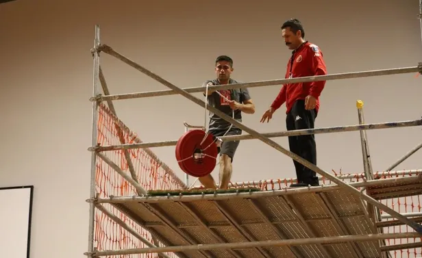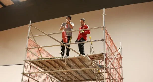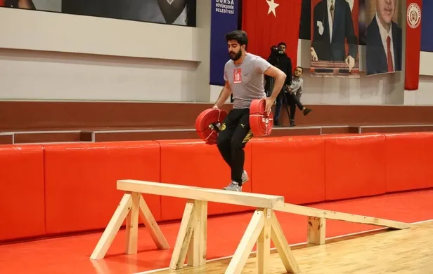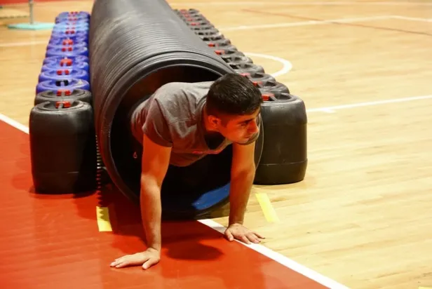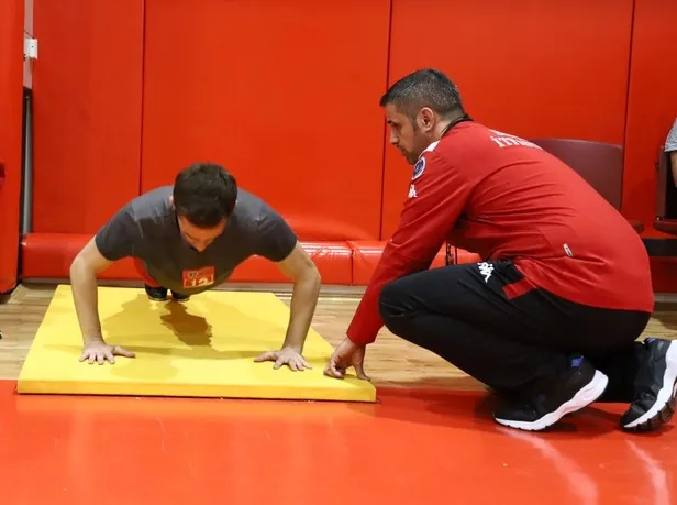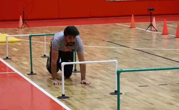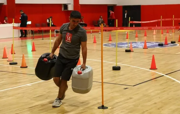 Mekik ve şınav çektikten sonra slalom koşu yapan adaylar, ağırlık taşıyıp engel üzerinden atladı, boru içinden geçti. Salon içinde hazırlanan kuleye merdivenle tırmanan adaylar, halatla yukarıya hortum çekti.