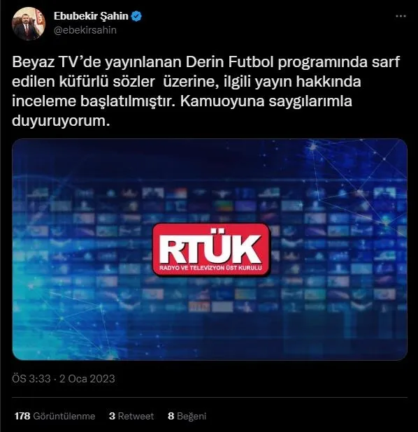 Son dakika haberi! Radyo ve Televizyon Üst Kurulu (RTÜK) Başkanı Ebubekir Şahin, Beyaz TV'de yayınlanan Derin Futbol programındaki rezaletle ilgili inceleme başlatıldığını açıkladı. Canlı yayınlanan programda büyük bir rezalete imza atan Rasim Ozan Kütahyalı, şarkı sözünü küfürlü ifadeler kullanarak tekrarlamıştı.