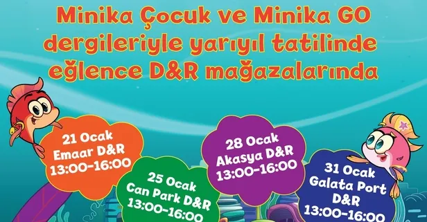 Yarıyıl tatiline eğlence katmak isteyen Minika Çocuk ve Minika Go dergi okurları D&R mağazalarında buluşuyor. Avantajlı dergi kampanyaları ve eğlenceli etkinlikler, 21-25-28 ve 31 Ocak tarihlerinde D&R mağazalarında okurları bekliyor.
