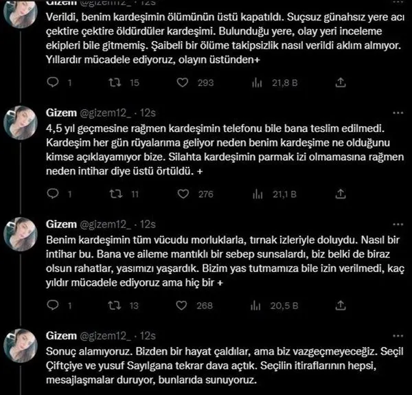 Türkiye günlerce eski sevgilisini önce kırık sandalye bacağıyla vurup sonra külotlu çorapla boğarak öldüren şarkıcı Seçil Çiftçi’nin cesedi ormanlık alana atmasını konuşurken kan donduran yeni bir iddia geldi. 2018 yılında henüz 19 yaşındayken göğsünden vurulmuş halde cesedi bulunan Yaren Korucu'nun ablası Gizem Korucu sosyal medya üzerinden yaptığı paylaşımda; 'Kardeşimi, Yusuf ve Yusuf'un o zamanki sevgilisi Seçil Çiftçi öldürdü' dedi.