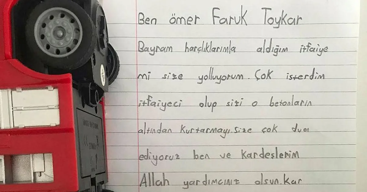 Türkiye Kahramanmaraş merkez üslü yaşanan çifte depremin ardından tek yürek oldu. Yaraların sarılması için seferber olunurken, deprem bölgesine oyuncak itfaiyesini yollayan Ömer Faruk Toykar isimli çocuğun kaleme aldığı not duygu dolu anlar yaşattı.