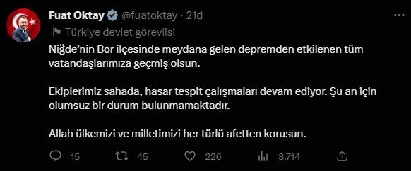 AFAD Deprem ve Risk Azaltma Genel Müdürü Orhan Tatar, "Niğde Bor'u bağımsız bir deprem olarak değerlendiriyoruz. Büyük depremlerden sonra hasarlı binalardan uzak durun." dedi.