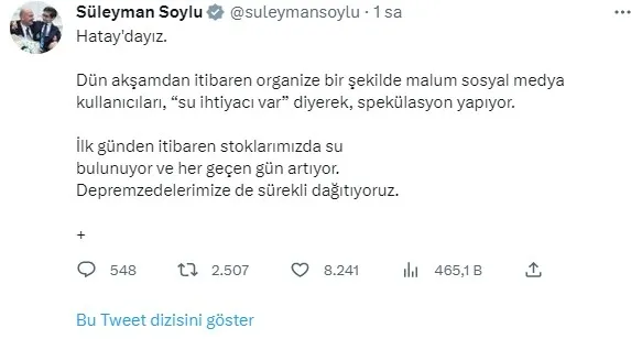 Soylu, "Hatay'dayız. Dün akşamdan itibaren organize bir şekilde malum sosyal medya kullanıcıları, 'su ihtiyacı var' diyerek, spekülasyon yapıyor. İlk günden itibaren stoklarımızda su bulunuyor ve her geçen gün artıyor. Depremzedelerimize de sürekli dağıtıyoruz. Buna rağmen deprem bölgesini "unutmadık" demek için yalan üreten hesaplarla ilgili gerekli suç duyuruları yapılmakta ve Emniyet Siber Daire Başkanlığımız tarafından konu hassasiyetle takip edilmektedir. Kamuoyuna saygıyla duyurulur." ifadelerine yer verdi.