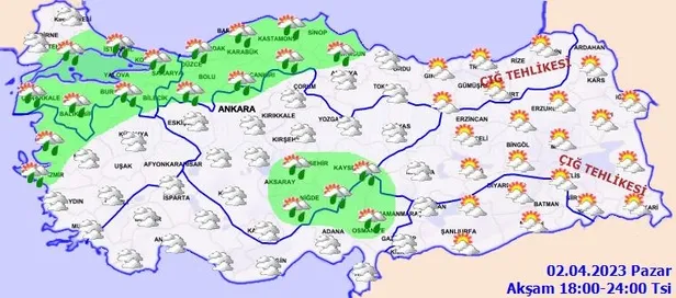 Meteoroloji Genel Müdürlüğü tarafından yapılan son değerlendirmelere göre: Ülkemiz genelinin parçalı ve çok bulutlu, Marmara'nın güney ve doğusu, Kuzey ve İç Ege, Akdeniz ve Batı Karadeniz ile Tekirdağ, Samsun, Çorum, Eskişehir, Çankırı, Ankara'nın kuzey ve batı ilçeleri, Aksaray, Niğde, Nevşehir, Kayseri, Gaziantep ve Kilis çevrelerinin aralıklı sağanak yağışlı geçeceği tahmin ediliyor. Sabah ve gece saatlerinde doğu kesimlerde buzlanma ve don olayı bekleniyor. Doğu Karadeniz'in iç kesimleri ile Doğu Anadolu'nun eğimli ve yüksek kesimlerinde çığ tehlikesi riski bulunmaktadır.