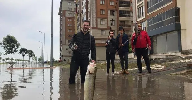 Göle dönen caddede temsili olarak balık tutan gençler, CHP'li belediyeye tepkisini ifade etti.