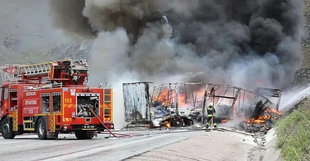 Erzincan'da kimyasal yapıştırıcı spreyi ve ev eşyası yüklü iki TIR çarpıştı. Kaza sonrası çıkan yangında alevler kara yolunu kaplarken, ulaşım çift yönlü durduruldu. İtfaiye ekiplerinin müdahalesiyle söndürülen yangında, araç sürücülerinin olay yerinde hayatını kaybettiği belirlendi.