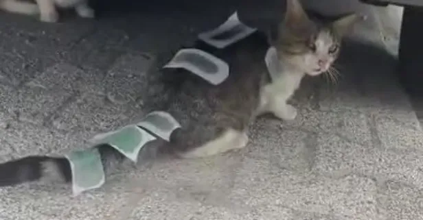 Bir sokak kedisinin vücudunun çeşitli yerlerine ağda bantları yapıştırıldığı görüldü.