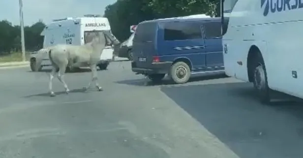 Odunpazarı İlçesi 71 Evler Mahallesi Balsu Bulvarı'nda dün cep telefonu ile kaydedilen görüntüde bir minibüsün ardına bağlanan at, yoğun akan trafikte şehir merkezine doğru ilerlediği görüldü.
