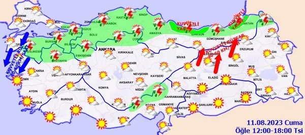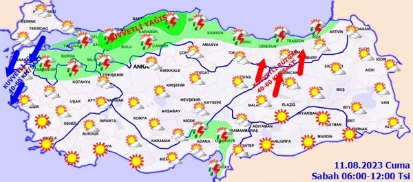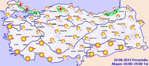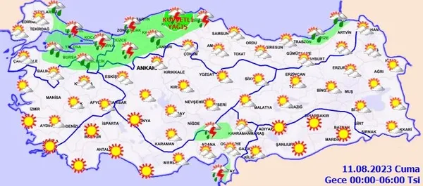 Marmara'nın doğusu, Batı Karadeniz, Orta ve Doğu Karadeniz kıyıları, Kırklareli, Eskişehir, Çankırı çevreleri, Kütahya'nın doğu kesimleri ile Ankara'nın kuzeybatı kesimlerinin yerel olmak üzere sağanak ve yer yer gök gürültülü sağanak yağışlı, diğer yerlerin az bulutlu ve açık geçeceği tahmin ediliyor.