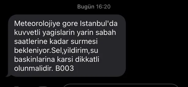 AFAD tarafından vatandaşlara gönderilen mesajda "Meteorolojiye göre İstanbul'da kuvvetli yağışların yarın sabah saatlerine kadar sürmesi bekleniyor. Sel, yıldırım,su baskınlarina karşı dikkatli olunmalıdır" ifadeleri kullanıldı.