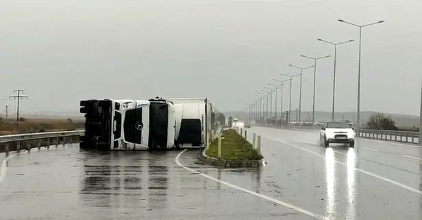 Edirne'de rüzgar TIR devirdiSAĞANAK ETKİLİ OLDU