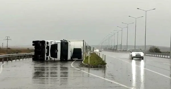 Edirne'nin İpsala ilçesinde gece yarısından itibaren etkisini sürdüren kuvvetli rüzgar nedeniyle Yunanistan'a açılan İpsala Sınır Kapısı yakınlarında emniyet şeridinde park halindeki bir TIR devrildi.