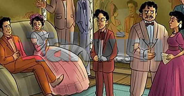 Parti odasında oturan bir grup insanın olduğu bir resimde, vampiri tespit etmek için diğerlerinden farklı olan kişiyi bulmalısınız. İpucu: Aynada yansıması olmayan kişi vampirdir.