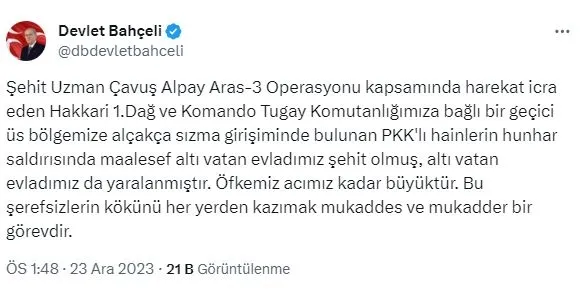 "Irak'ın Kuzeyi'nde, 22 Aralık 2023 tarihinde bölücü terör örgütü mensupları tarafından yapılan saldırı ve akabinde sağlanan temasta yaralanan 4 kahraman silah arkadaşımızdan 3'ü tüm müdahalelere rağmen kurtarılamayarak şehit olmuştur.