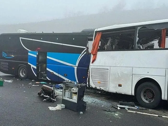 Korkunç kaza dün sabaha karşı meydana geldi. Yoğun sisin oluştuğu yolda, ilk olarak sol şeritte yavaşlayan kamyonete arkasından gelen yolcu otobüsü çarptı. Araçlar, yolun sol şeridinde kaza nedeniyle dururken, otobüsteki yolculardan bazıları da yola indi.