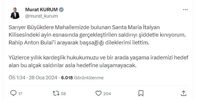 Saldırıyı şiddetle kınadığını belirten Kurum, "Sarıyer Büyükdere Mahallemizde bulunan Santa Maria İtalyan Kilisesindeki ayin esnasında gerçekleştirilen saldırıyı şiddetle kınıyorum. Rahip Anton Bulai'i arayarak başsağlığı dileklerimi ilettim. Yüzlerce yıllık kardeşlik hukukumuzu ve bir arada yaşama irademizi hedef alan bu alçak saldırılar asla hedefine ulaşamayacak" ifadelerini kullandı.