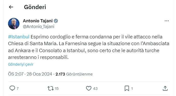 İtalya Dışişleri Bakanı Antonio Tajani kilise saldırısıyla ilgili sosyal medya hesabından bir paylaşımda bulundu. Santa Maria Kilisesi'nde gerçekleşen "korkak saldırıyı" kınadığını ve başsağlığı dileklerini ilettiğini belirten İtalyan Bakan, "Ankara'daki büyükelçiliğimiz ve İstanbul'daki konsolosluğumuzla durumu takip ediyoruz. Türk yetkililerin sorumluları yakalayacağından eminim" dedi.