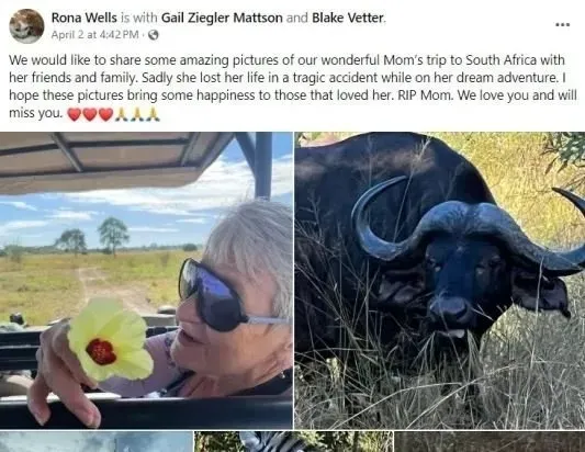Aileden yapılan açıklamaya göre; Minnesota'dan 79 yaşındaki Gail Mattson'un Zambiya'daki safari aracına beş tonluk bir filin saldırdığı gün, mutlu bir şekilde fotoğraflanmıştı. Fakat o mutlu gün mutlu bitemedi.