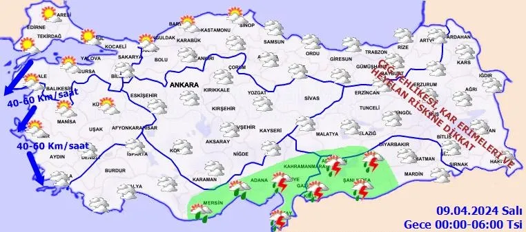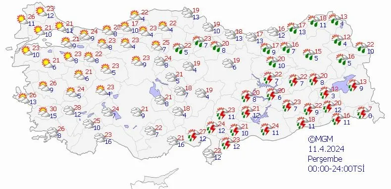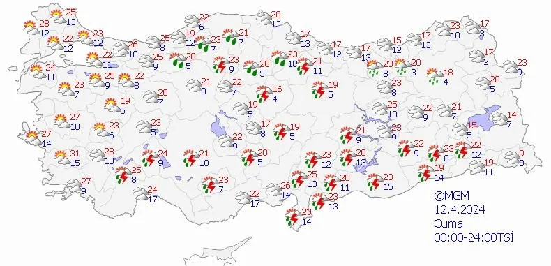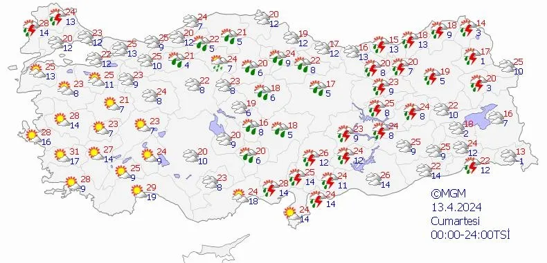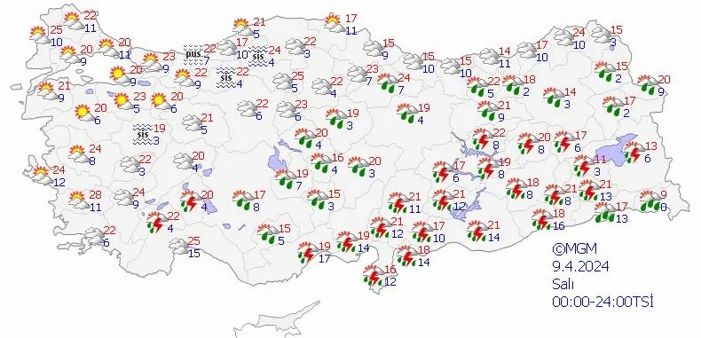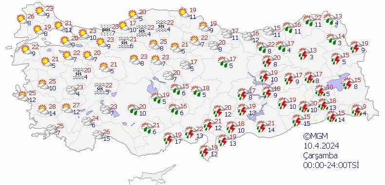 Meteoroloji Genel Müdürlüğü yapılan son değerlendirmesini yayınladı: Ülkemiz genelinin parçalı yer yer çok bulutlu, İç Ege'nin doğusu, Doğu Akdeniz ve Antalya'nın iç kesimleri, İç Anadolu'nun güney ve doğusu, (Artvin hariç) Orta ve Doğu Karadeniz, (Iğdır, Ardahan dışında) Doğu ve Güneydoğu Anadolu'nun sağanak ve gök gürültülü sağanak yağışlı geçeceği, yağışların İç Anadolu'nun doğusu ve Doğu Anadolu'nun doğusundaki yüksek kesimlerde karla karışık yağmur ve yer yer kar şeklinde görüleceği tahmin ediliyor. Yağışların Güneydoğu Anadolu'nun doğusunda yerel kuvvetli olması bekleniyor.