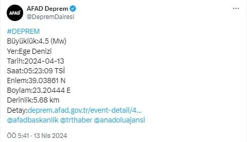 Afet ve Acil Durum Yönetimi Başkanlığı'nın (AFAD) internet sitesinde yer alan bilgiye göre, merkez üssü Ege Denizi olan 4,5 büyüklüğünde sarsıntı kaydedildi.