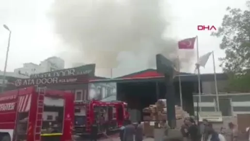 Esenyurt'ta kapı üretilen imalathanede çıkan yangın, itfaiye ekiplerince söndürülmeye çalışılıyor.