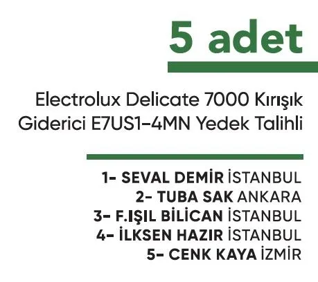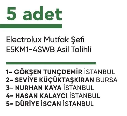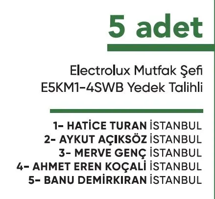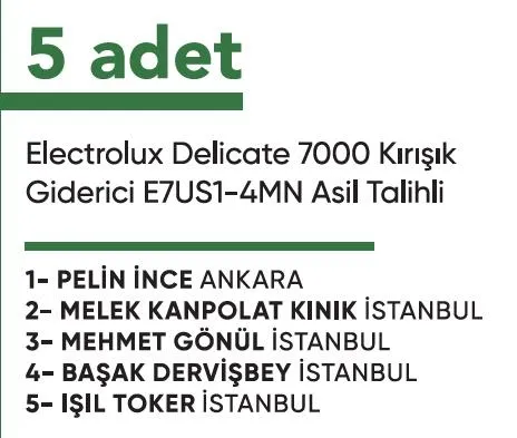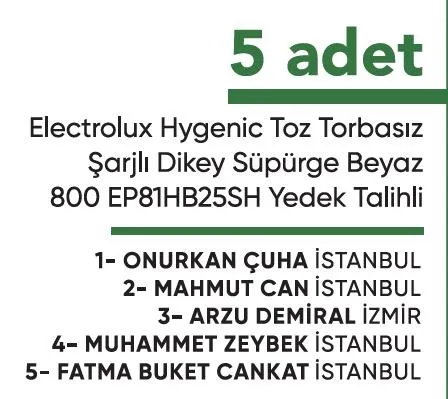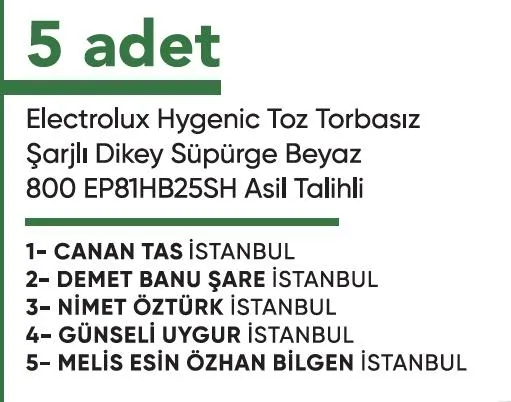 TAZEDİREKT kampanyası çekiliş sonuçları belli oldu. Çekilişe katılan talihliler, Electrolux Hygenic toz torbasız şarjlı dikey süpürge beyaz 800 EP81HB25SH, Electrolux Mutfak Şefi E5KM1-4SWB, Electrolux Delicate 7000 Kırışık Giderici E7US1-4MN kazandı. İşte asil ve yedek talihliler...