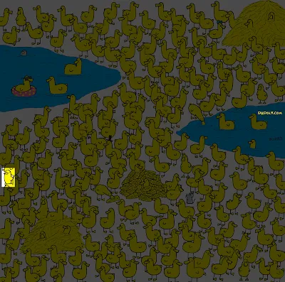 Ünlü bulmaca ustası Dudolf, zekice tasarladığı yeni bir görsel zeka oyunuyla yine dikkatleri üzerine çekiyor. Açık havada geçen ve sarı ördeklerle dolu bu sahnede, ziyaretçiler aralarında gizlenmiş küçük bir civcivi bulmaya çalışıyor. Dudolf'un eserleri her zaman olduğu gibi hem zorlayıcı hem de sevimli bir çekiciliğe sahip.