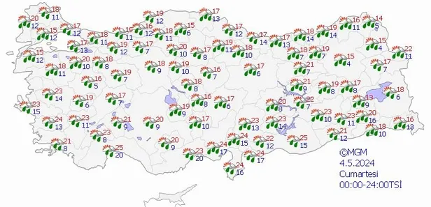 Meteorolojiden yapılan son değerlendirmelere göre: Ülkemiz genelinin parçalı ve çok bulutlu, Ege kıyıları ve Batı Akdeniz haric diğer bölgelerimizin aralıklı sağanak ve yer yer gök gürültülü sağanak yağışlı geçeceği tahmin ediliyor. Yağışların; Trakya (Edirne ve Kırklareli çevreleri ile Tekirdağ'ın iç kesimleri), Doğu kesimlerde (Mardin, Batman, Bitlis, Siirt, Şırnak, Hakkari'nin güneyi, Erzurum, Kars, Ardahan, Ağrı, Iğdır ve Van'ın kuzeyi), Doğu Akdeniz (Adana'nın doğusu, Osmaniye ile Hatay'ın kuzey ilçelerinde) ve Artvin çevrelerinde yerel kuvvetli olması bekleniyor.