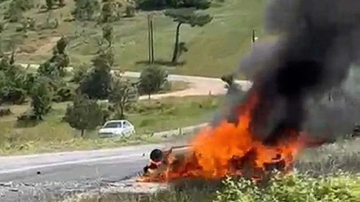 Çarpışmanın şiddetiyle otomobillerden biri alev alırken, diğer otomobil ise araziye savruldu.