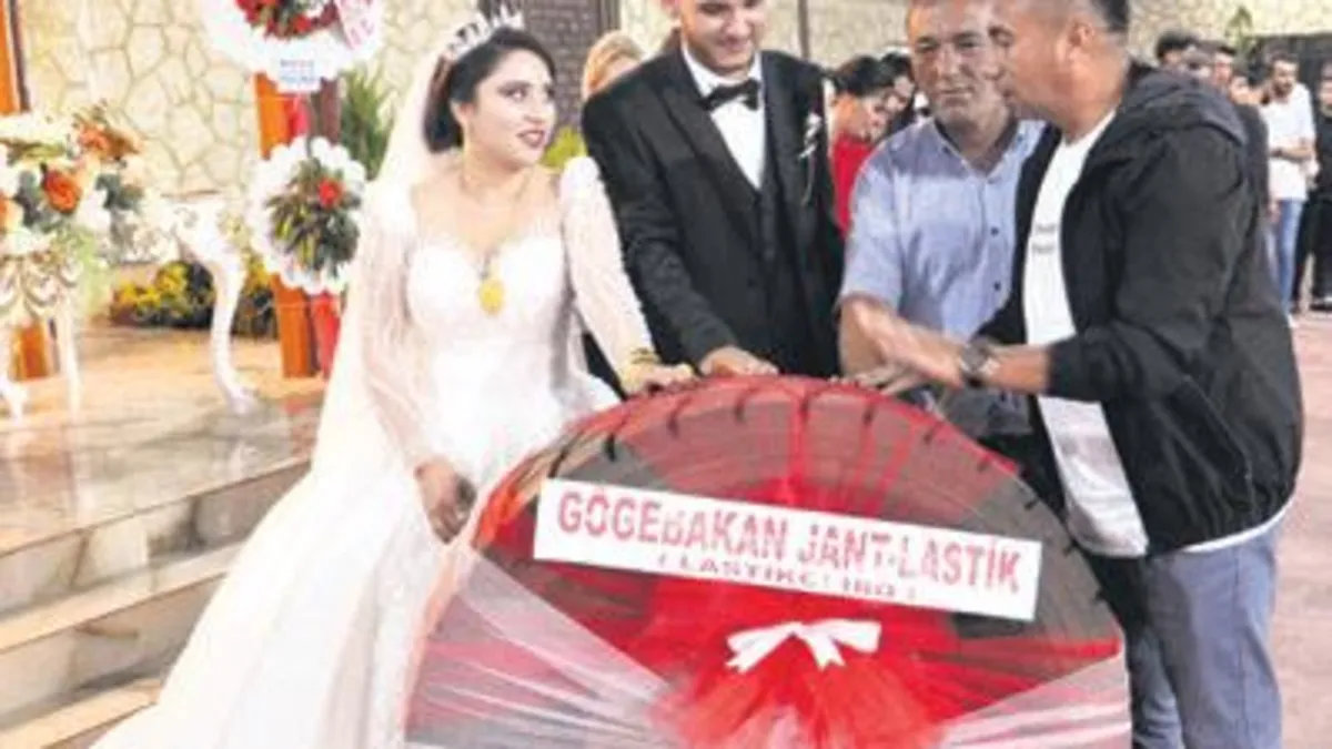 Gaziantep'teBüşra ve Alican Yıldırım çifti, bir düğün salonunda yapılan törenle hayatlarını birleştirdi. Davetlilerden lastik bayisi İbrahim Göğebakan, TIR şoförlüğü yapan arkadaşı Alican'a hediye olarak süslediği araç lastiğini hediye etti. Arkadaşlarının hediyesi karşısında şaşıran damat, "Böyle bir şey beklemiyordum. Süper oldu. Kendilerine teşekkür ediyorum" dedi.